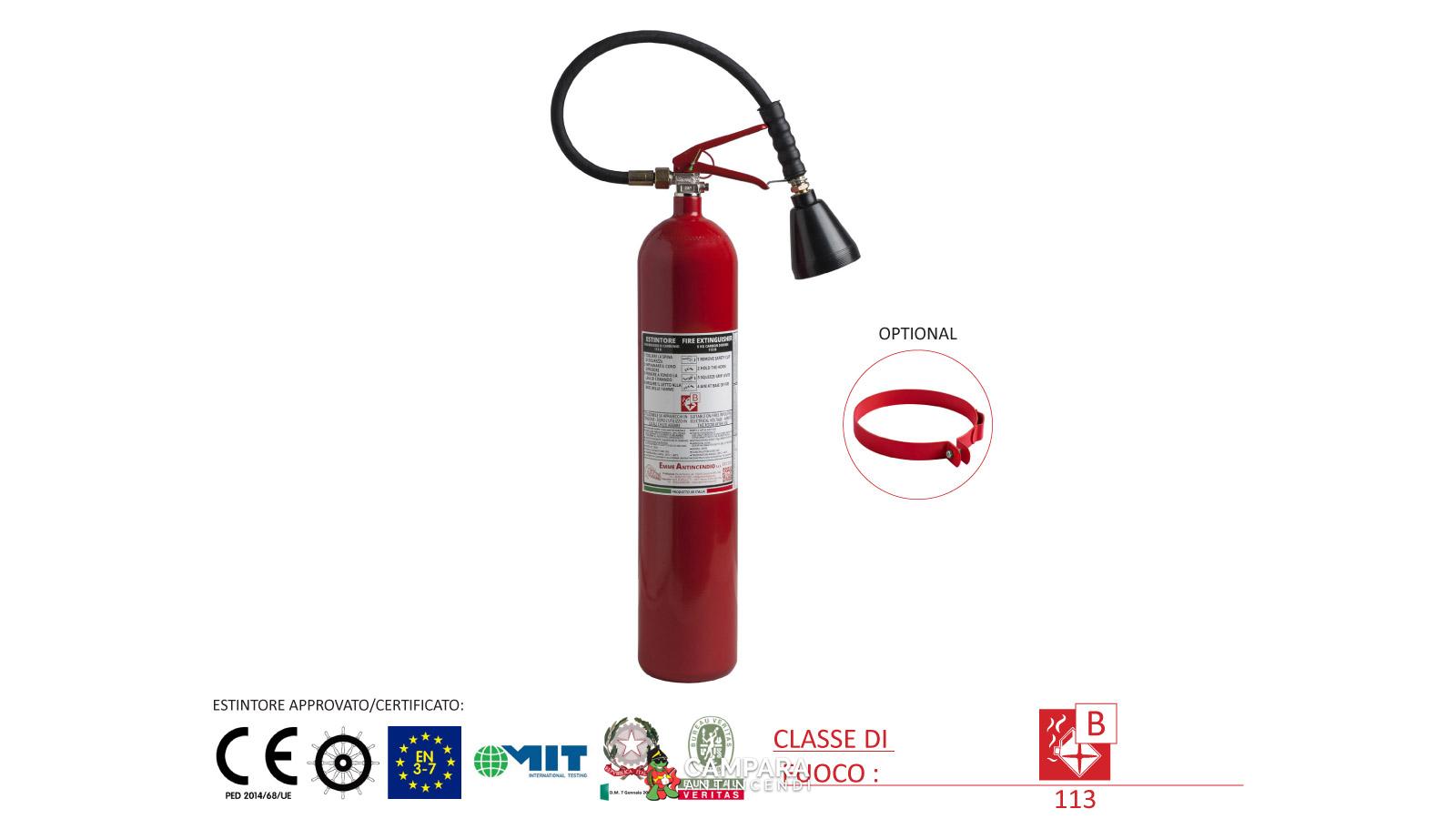 Estintore CO2 da 5 Kg , temperatura di utilizzo da -30°C a +60°C, costruito in accordo alla norma UNI EN 3-7 (D.M. 7.1.2005), approvato Marine Equipment Directive MED 2014/90/UE, certificato secondo la direttiva per attrezzature a pressione PED 2014/68/UE.