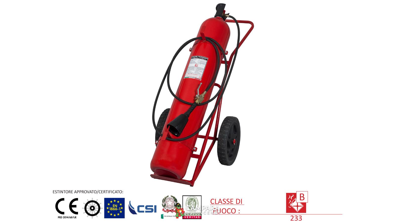 Estintore carrellato Co2 da 20, 30, 50Kg, temperatura di utilizzo da -30°C a +60°C, costruito in accordo alla norma UNI EN 1866-1 (D.M. 6.3.92), modello 14504 approvato da European Marine Directive MED 2014/90/UE, S.O.L.A.S. (Safety of life at sea) ‘74 (2000), modello 17504 certificato secondo la direttiva per attrezzature a pressione PED 2014/68/UE.