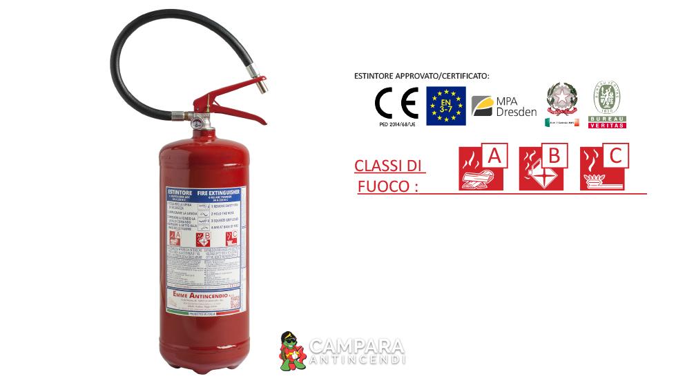 Estintore a polvere da 6 Kg , temperatura di utilizzo da -30°C a +60°C, costruito in accordo alla norma UNI EN 3-7 (D.M. 7.1.2005), certificato secondo la direttiva per attrezzature a pressione PED 2014/68/UE.