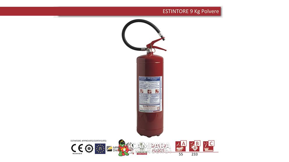 Estintore a polvere da 9 Kg , temperatura di utilizzo da -30°C a +60°C, costruito in accordo alla norma UNI EN 3-7 (D.M. 7.1.2005), approvato Marine Equipment Directive MED 2014/90/UE, certificato secondo la direttiva per attrezzature a pressione PED 2014/68/UE.