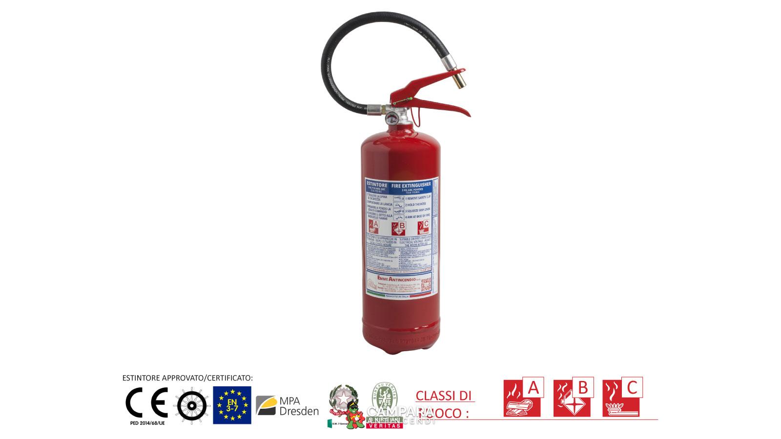 Estintore a polvere da 3 Kg , temperatura di utilizzo da -30°C a +60°C, costruito in accordo alla norma UNI EN 3-7, approvato Marine Equipment Directive MED 2014/90/UE, certificato secondo la direttiva per attrezzature a pressione PED 2014/68/UE.