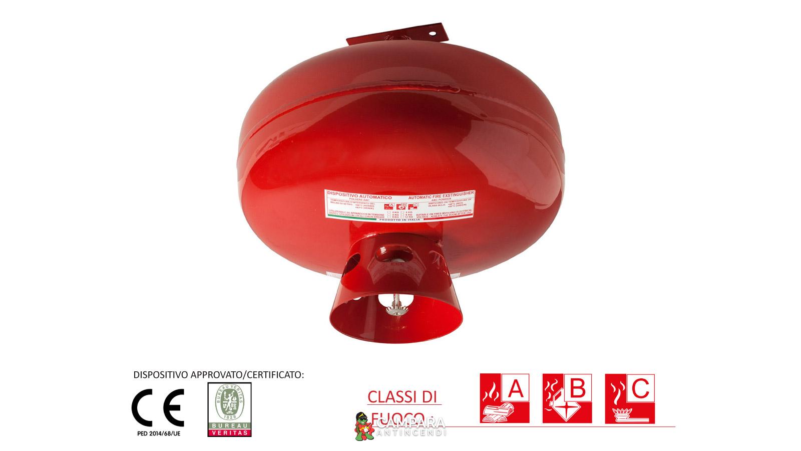 Dispositivo antincendio automatico a polvere da 3, 6 e 12 Kg , temperatura di utilizzo da -30°C a +60°C, certificato secondo la direttiva per attrezzature a pressione PED 2014/68/UE.)