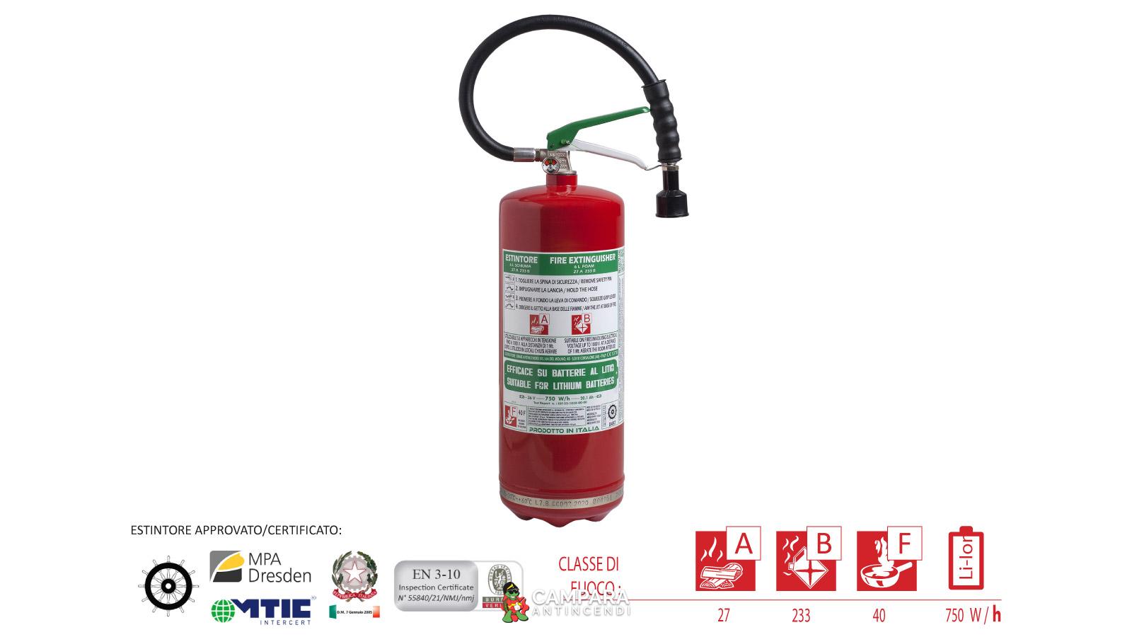 Estintore con Involucro in Acciaio Inox adatto allo spegnimento di batterie al Litio; agente estinguente a Schiuma da 6 Litri costruito in accordo alla norma UNI EN 3-7, approvato MED 2014/90/UE, certificato secondo la direttiva per attrezzature a pressione PED 2014/68/UE, realizzato in conformità ai controlli di produzione secondo norma EN 3-10.