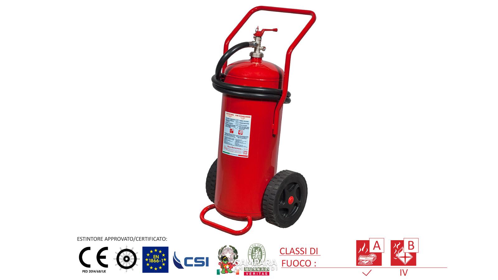 Estintore carrellato a schiuma da 25, 50 e 100 Litri, temperatura di utilizzo da +5°C a +60°C, costruito in accordo alla norma UNI EN 1866-1, approvato da European Marine Directive MED 2014/90/UE, S.O.L.A.S. (Safety of life at sea) ‘74 (2000), certificato secondo la direttiva per attrezzature a pressione PED 2014/68/UE.
